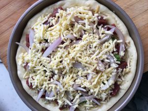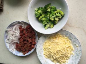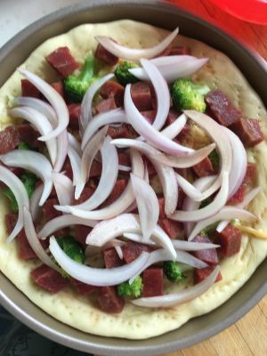 饼面上先铺一层奶酪,再放上一圈西兰花,放上牛肉粒,再撒上洋葱