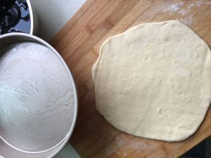 醒好的面团擀成圆形面皮(粘时可撒些干粉),披萨盘涂一层剩余的油