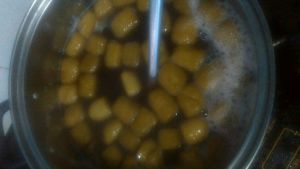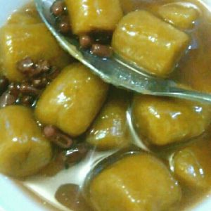 红豆汤我是事先煮好的,汤水滚烫时把南瓜圆倒下去煮