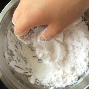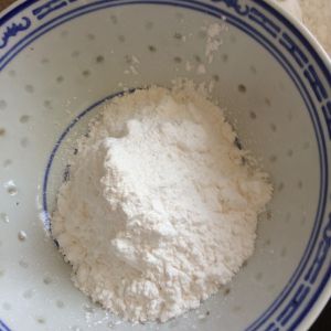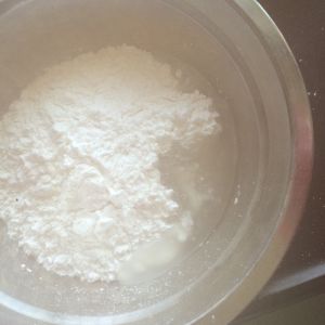 先拿一份木薯粉,倒两到三勺开水,或者自己掌握量,用手或筷子,搅拌到絮状
