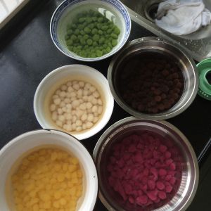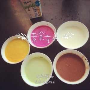 把五种颜色调配好:把火龙果,芒果放搅拌机或者果汁机打碎,芒果可以加适量的水或牛奶,因为芒果几乎没有果汁!打好后,过滤出果汁!把可可粉和青汁粉放适量水或牛奶调配好,白色的可以用水或牛奶
