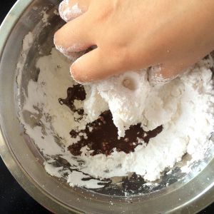 揉到有小团状后,开始加调配好的颜色,要少量多次慢慢的加入,不然粉太稀就会粘手