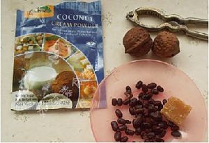 把核桃、椰浆粉、黄片糖、熟红豆加适量温水用料理机打匀即可;