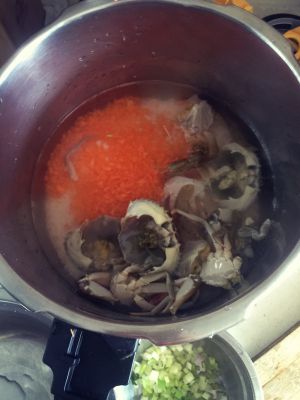 大米洗净备用,干贝泡开,在这期间杀螃蟹,胡萝卜去皮洗净切碎,然后再把干贝切碎