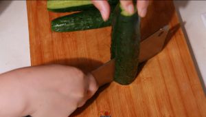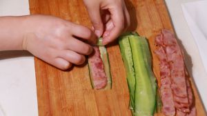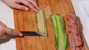 抹好千岛酱的黄瓜片上放培根,双手持黄瓜片一端慢慢卷起。