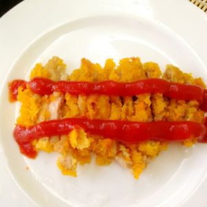 炒锅里倒入油,开中小火,把鸡肉饼放进去,肉饼煎好一面,再翻面,煎熟即可。盛入放了油纸盘中。吸掉油,撒上蕃茄酱,开吃。
