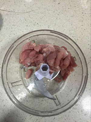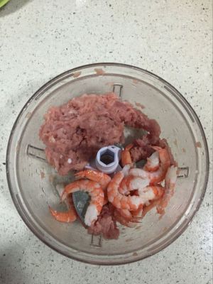 搅至细碎后,再将焯好剥好的虾仁加入,同样微搅拌一下。