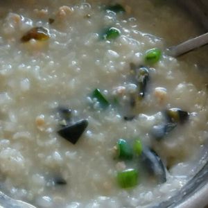 白粥煮好后,倒入皮蛋和瘦肉搅匀,开火煮至瘦肉熟了即可