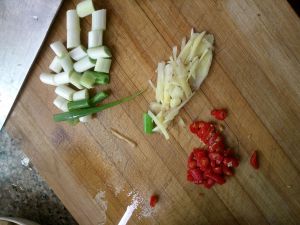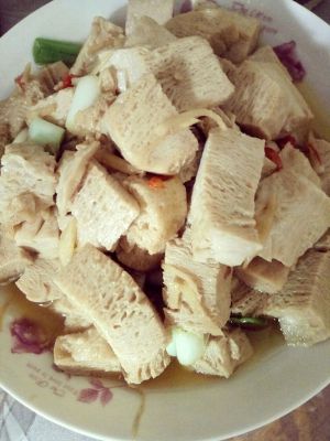 把油烧热将豆腐和小米辣一起放入锅中炒2分钟,再加点水,然后再生抽和耗油,放入葱和姜,再炒2分钟,最后加盐和鸡精