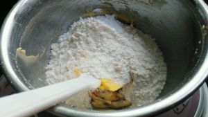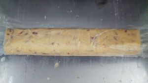 将面团放进保鲜膜里搓成长柱型放入冰箱冷冻一个小时。