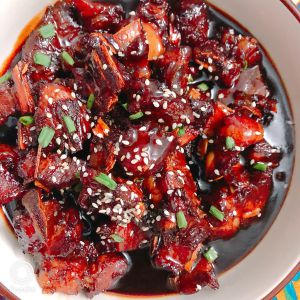 锅热油,把排骨捞出放油锅煎,不用太多油,排骨煎的有香味出来了,就把刚才腌制排骨的汁放进去,再加一碗水,加三勺糖,焖至收汁,放一点盐,鸡精提味!就可以出锅了
