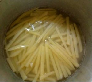 土豆切条,不要太小,用盐水泡30分钟,水开后,下锅煮5分钟(不要煮软了,太软炸了容易碎)