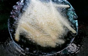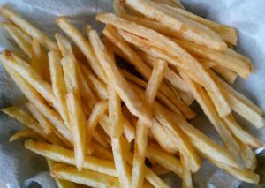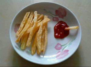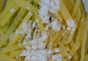 锅中到油,温热后加入土豆条,炸至稍硬捞出