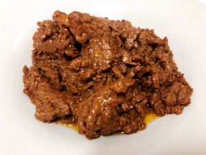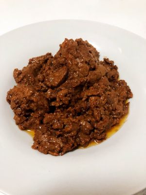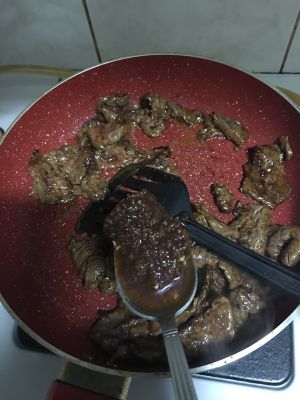 热锅冷油,油不能多,因为沙茶酱本来就很油。炒牛肉,牛肉略微变色后加入两勺沙茶酱炒匀,我的牛肉就炒了3分钟