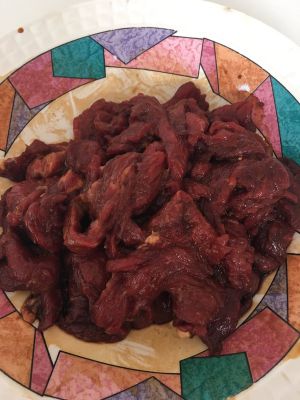 牛肉洗净吸干水份切片,倒入一小勺老抽,料酒,蚝油,少量盐提味,最后加入一勺淀粉拌匀腌制10分钟(小汤勺)