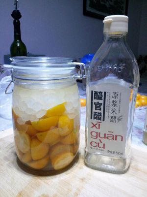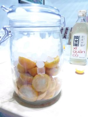 2、对半切开后放入密封瓶中,洒入黄冰糖。