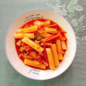 起锅倒油,油适量,油热后放入胡萝卜洋葱炒香,别炒太久,一会会就好,再放入辣白菜和火腿肠炒,炒一会放入年糕,放入辣酱再炒一会(放点酱油和少许盐提味)