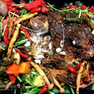 6.找一个平锅,一点油,放洋葱铺底,把炸好的鱼放在上面,把炒好的配料均匀铺在鱼身上,开小火,20_25分钟以后,放小葱,香菜,孜然,黑芝麻,关火。