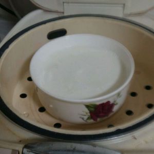把牛奶倒入蛋清里,轻轻拌,把那一层膜浮起来。到上面一层膜也有了。