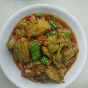 锅内留底油,依次放入葱花,蕃茄,尖椒,稍煸炒后放入茄子