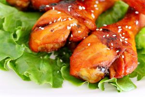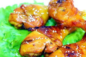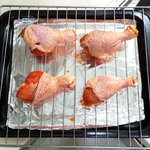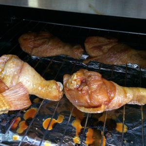 入预热好的烤箱内,190度上下火,约40分钟。把放有鸡腿的网架放在中层,铺好锡纸的烤盘放在下层,可以接住滴落的液体。烤制10分钟后,取出刷上腌制后剩下的烤料汁。接着烤15分钟,整个鸡腿都涮上蜂蜜水,(蜂蜜内加入一点点水调和即可),继续烤15分钟即可。