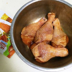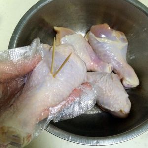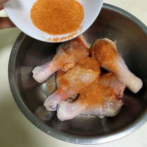 把粉料和鸡腿混合均匀,可以直接用手涂抹混合。