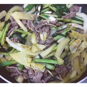 不用洗锅,直接倒入酸菜煸炒,放入水焖一下后放入牛肉,配菜翻炒,放入鸡粉,盐继续翻炒至熟就可以了