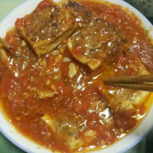 把做好的西红柿酱淋在豆腐上就可以开吃了!为了好看放上几根香菜点缀也可以!