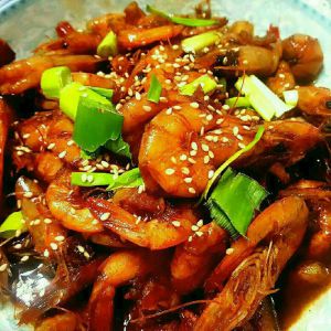 锅内放入少许油,油热放入生姜和葱,大蒜瓣榨油,放入炸好的大虾