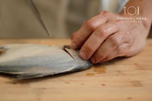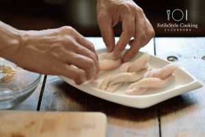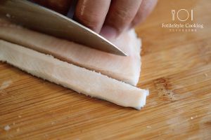 剔成带皮净鱼柳,纵向切成约2cm宽的长条,修成同样长度,共需3条。