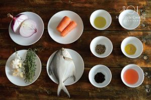 红鲳鱼500克,胡萝卜1根,洋葱1个,百里香适量,盐10克,大蒜2瓣,红酒醋10ml,橄榄油30ml,黑胡椒粒10克,白胡椒籽5克,黄芥末酱15ml