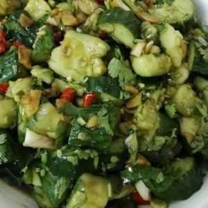 将腌渍好的黄瓜除掉多余的水分,倒入熬好的酱汁中,加入香菜,拌匀。