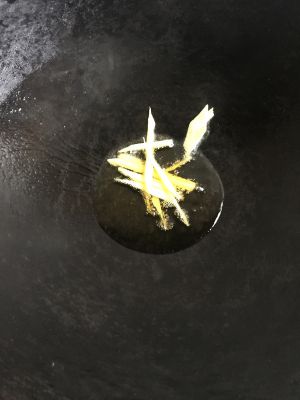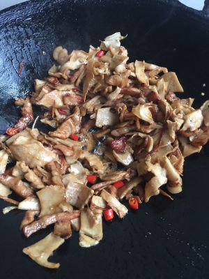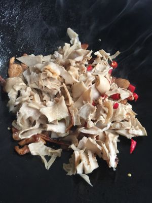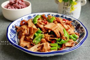 不停的翻炒同时少许淋些开水,量不要大,这道菜吃的就是干香味儿。最后下青椒加盐调味即可装盘盛出!