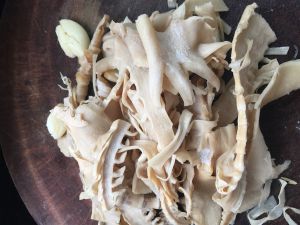 将笋干提前泡软,并改刀切成2厘米左右小块。
