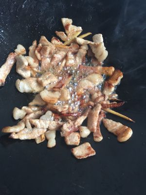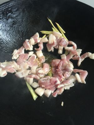 将肉片的肥肉逼出油后,加料酒,酱油继续煸炒。