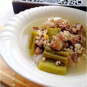 猪排骨斩块,苦瓜洗净切段,薏米可事先浸泡半小时。