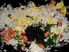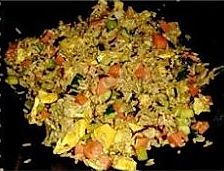 加入炒熟的鸡蛋丁、青瓜丁、放腿肉丁、橄榄菜一起翻炒均匀;