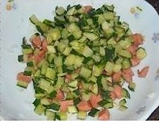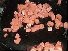 加入青瓜丁翻炒,青瓜炒至变色即可;盛起备用;