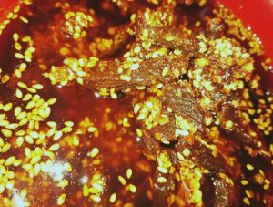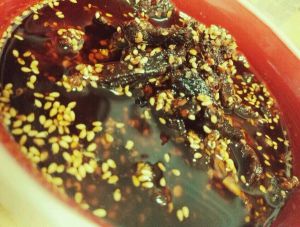 起锅后我把里面的哪些大块儿作料挑出来,然后再倒进锅里,不开火,洒上熟白芝麻,冷却,装瓶