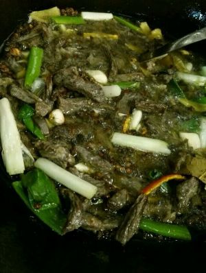 取锅倒入可以没过牛肉条的花生油,等油温热了,开中火下老姜片,葱段,然后再倒入放凉的牛肉,炒制,在炒制的过程中加三萘八角花椒香叶(这些香料都可以先用水泡一下,避免容易炒糊)蒜粒,小葱(一捆整棵的)干辣椒段,翻炒一分钟之后再放入干辣椒面,盐。转中小火,放的东西越多越要勤翻,不断的炒,免得糊掉了。觉得差不多了放入糖(怎么样为为差不多,我也不好定义,反正我都是尝的。关于糖我是放的白糖,但可能放冰糖和点红糖颜色会更好),一点点孜然,糖炒化后就可以起锅。