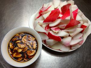 小萝卜切滚刀块。生抽,老抽,料酒,盐,糖,醋,味精,水淀粉,香油大蒜片调制成碗汁备用。