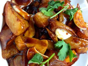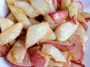 锅内留少许底油,锅热后下入炸制好的小萝卜并下入调制好的碗汁迅速翻炒,成熟。