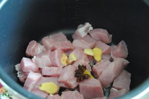 加入姜片,胡椒粉,花椒,八角,酱油和料酒