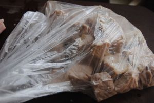 装进保鲜袋打烂肉块,因为煮软了很容易操作
