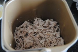 取出撕成丝放入面包桶,加入盐,盖上锡纸防止肉跳出,启动肉松键