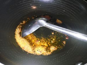 锅内热油,加入干辣椒、辣椒面,小火炒香,将油烧热