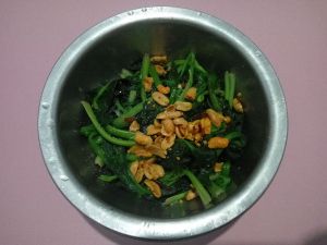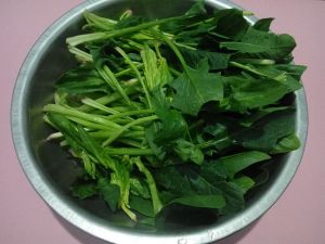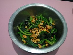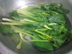 将刚烧开的热水倒入盆中,将菠菜烫透捞出,过一遍凉开水