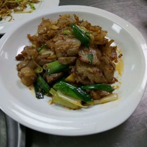 五花肉断生后冲凉,切片(长约六厘米宽约3厘米,不应过厚,否则卷不起来,而且口感更为油腻),青蒜斜刀切寸断,点火,润锅后加入少量猪油,下入切好的五花肉片,煸炒至肉片两端微微向上卷起(灯盏窝状),呆板平伸的肉片形状在回锅肉中是不可取的。肉片炒至七八成熟盛出沥干多余的油分备用。