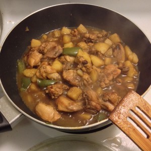 翻炒。后土豆,青椒,干辣椒,花椒,大料。糖。水。炖