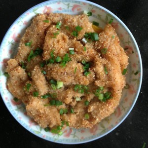 三线肉切薄片,比回锅肉稍厚。加料酒,花椒,生抽,盐,糖腌1个小时。挑出花椒,加入蒸肉粉,使其完全包裹肉片。